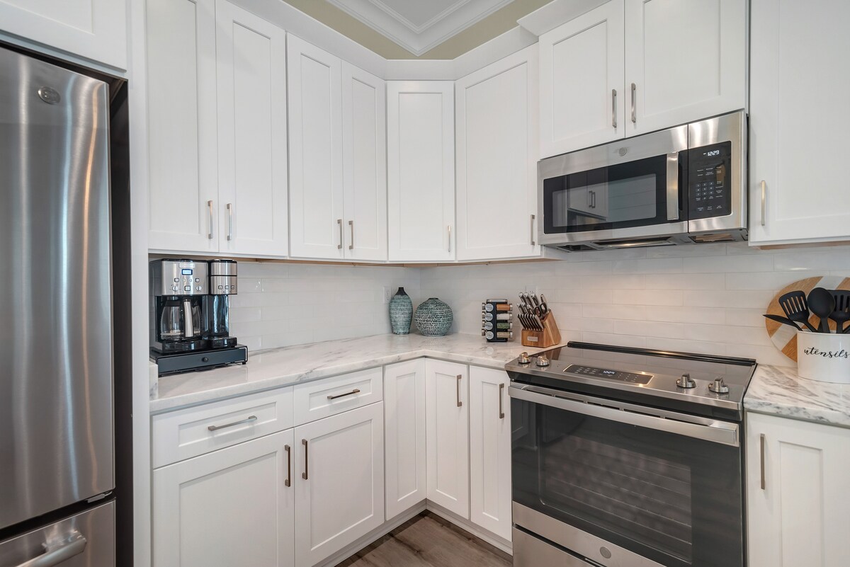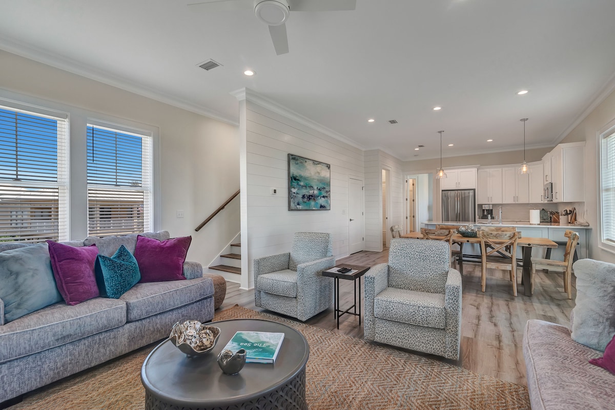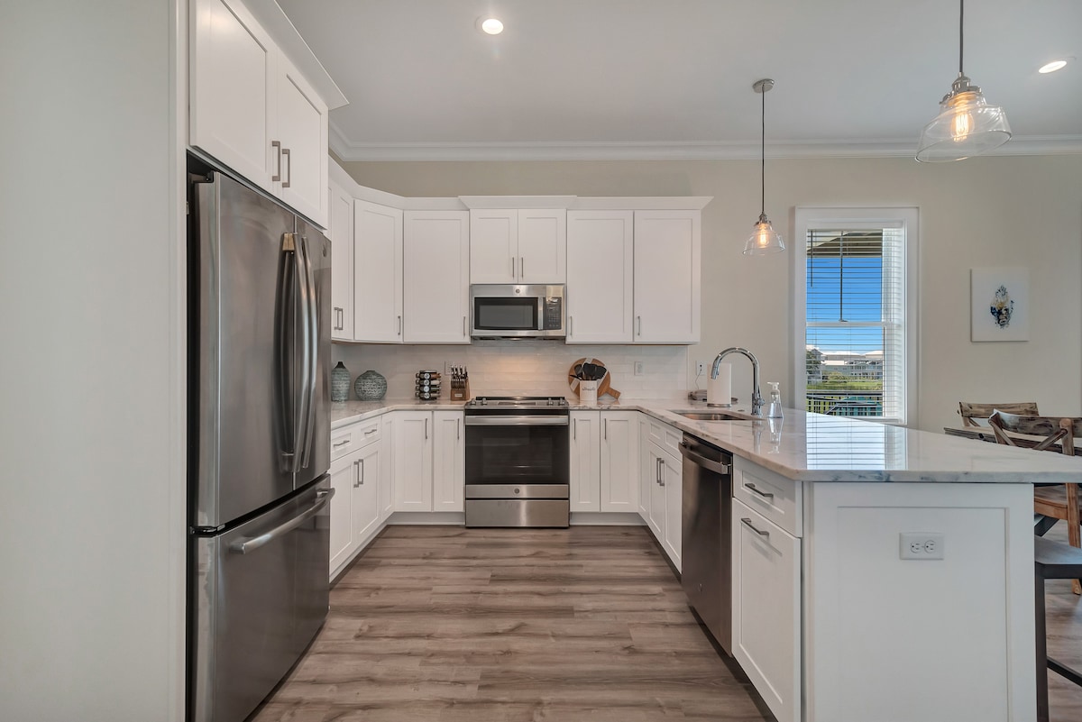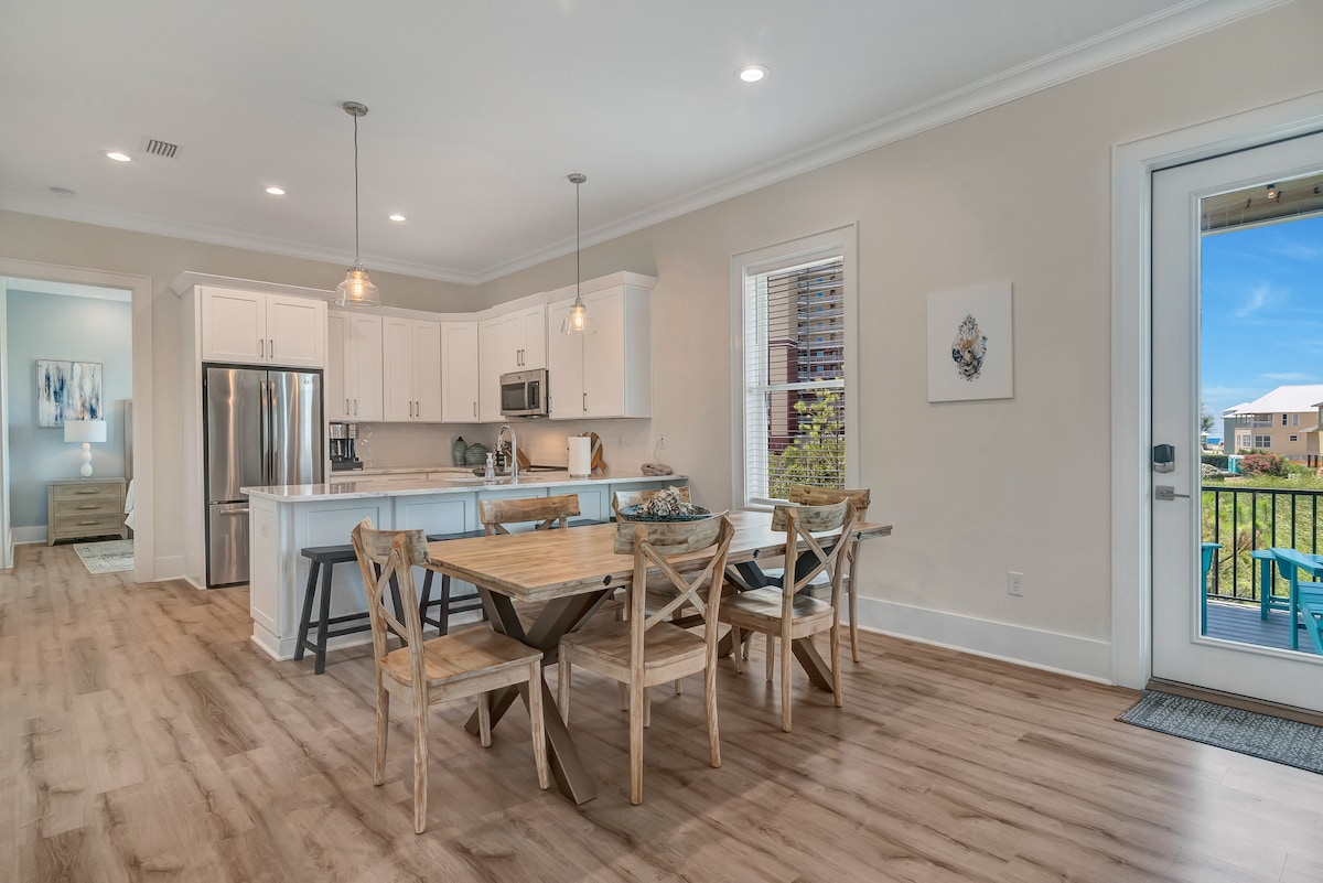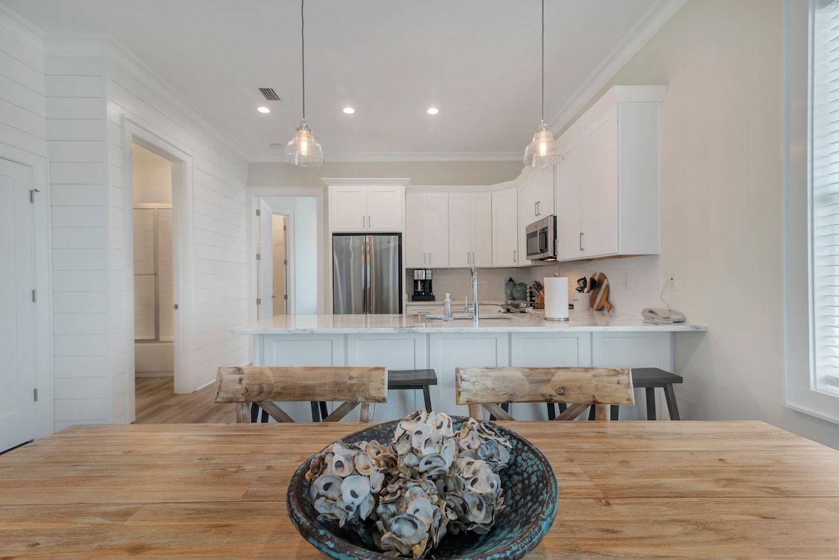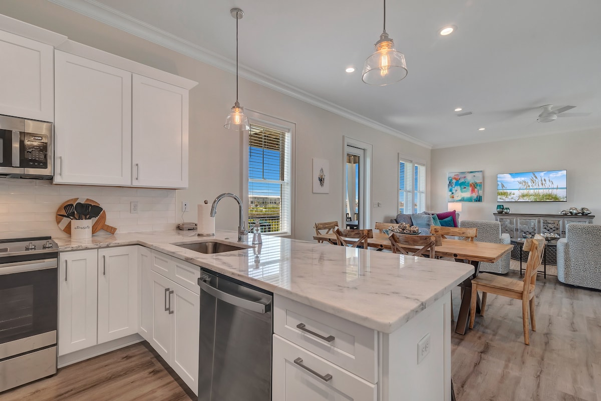 The First floor main living space in this charming Beach House has been professionally decorated with soft colors, cozy furnishings, and Modern chic décor. There is large comfortable seating and a large smart HDTV. Just off the main living area is a spacious deck with a beautiful view of the lagoon & pool and a Dining set with plenty of seating so you can have a family meal outside while watching the sunset. There is a formal dining area with a table big enough for 6 and bar seating areas. The kitchen has new stainless steel appliances and is fully stocked with all pots, pans, cooking utensils, & plates & glassware so you can make yourself at home during your Gulf Shores vacation. Behind the Kitchen is a full bathroom for your guests to enjoy and the Master bedroom has a king bed, Smart TV, and a private bathroom with a luxurious shower.