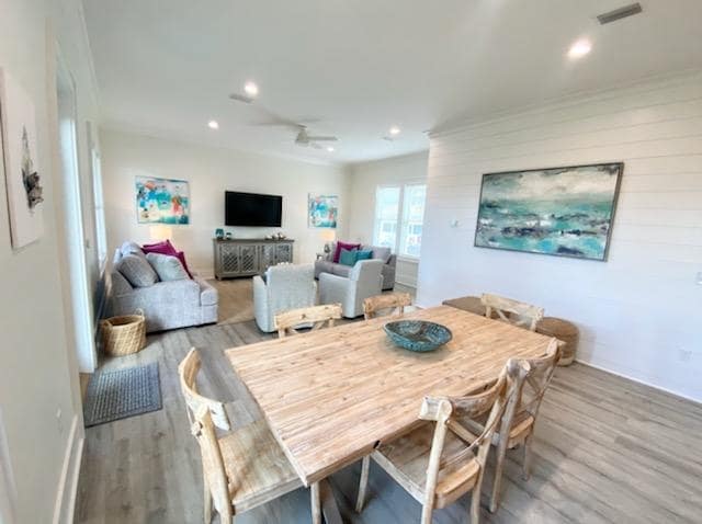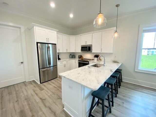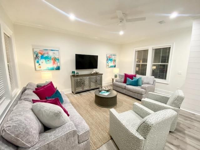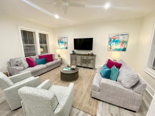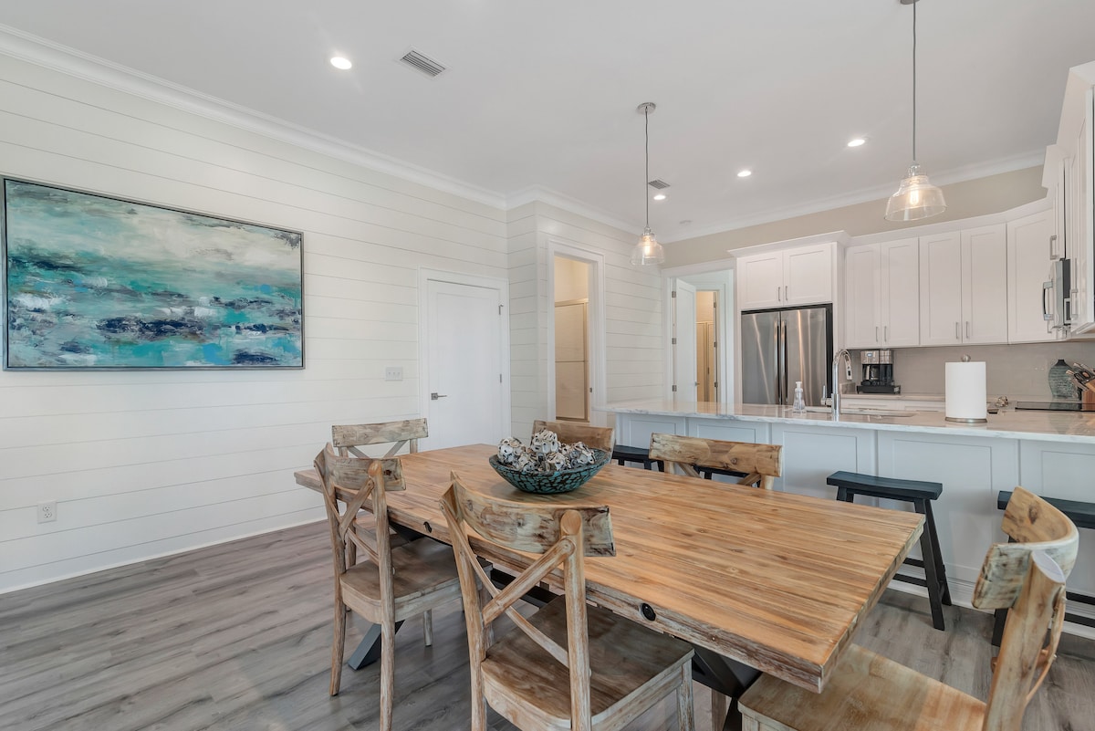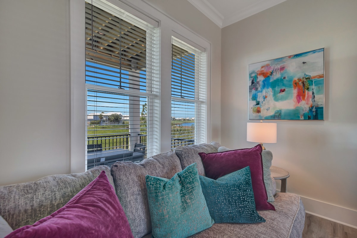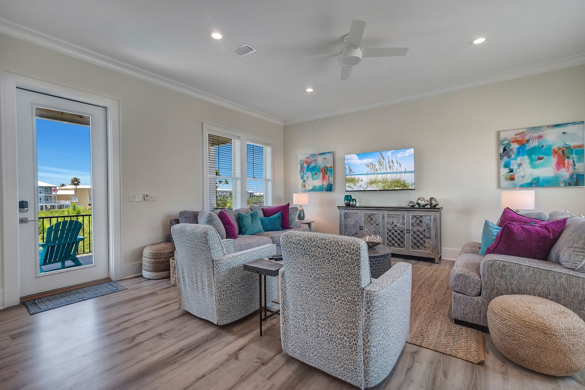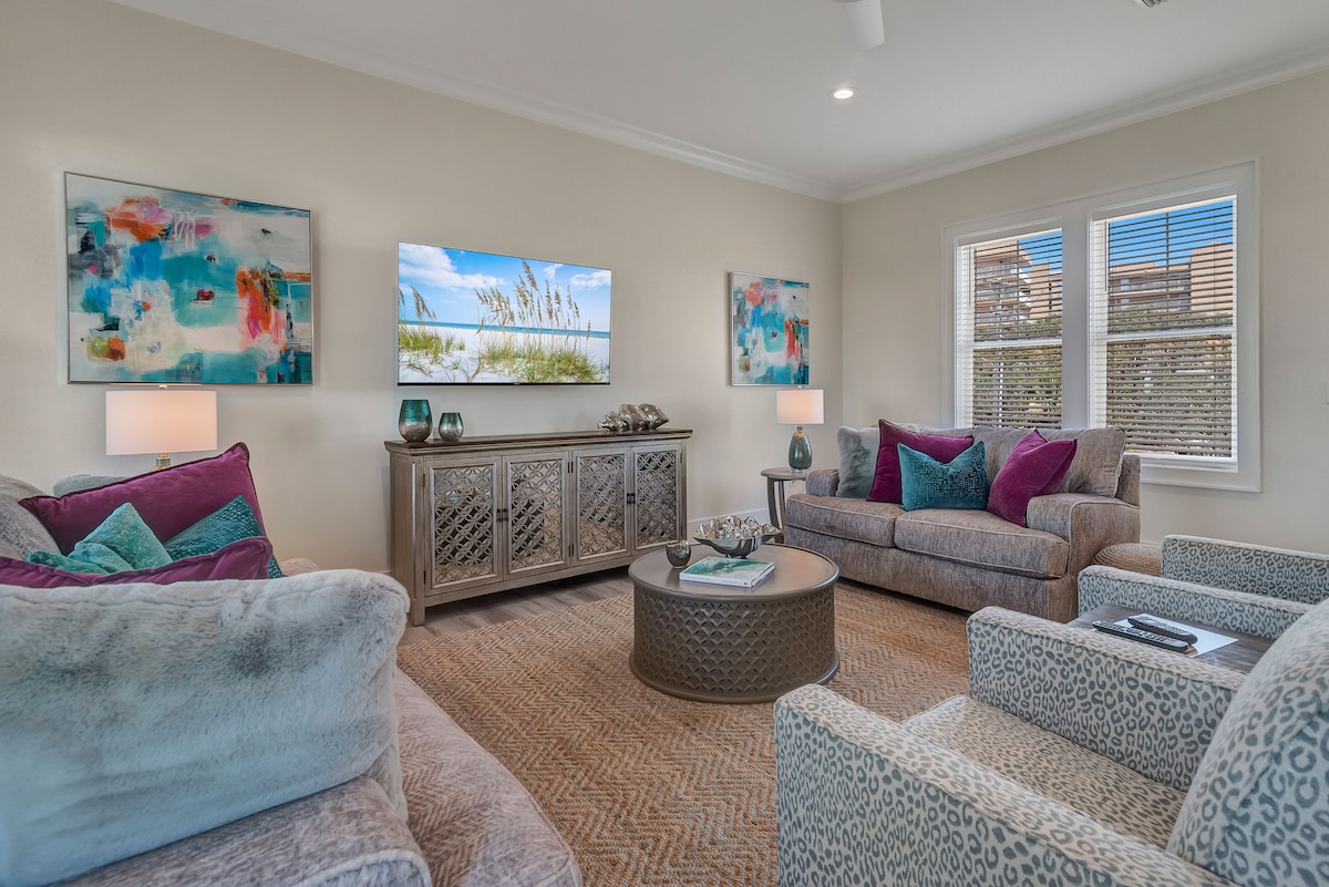The First floor main living space in this charming Beach House has been professionally decorated with soft colors, cozy furnishings, and Modern chic décor. There is large comfortable seating and a large smart HDTV. Just off the main living area is a spacious deck with a beautiful view of the lagoon & pool and a Dining set with plenty of seating so you can have a family meal outside while watching the sunset. There is a formal dining area with a table big enough for 6 and bar seating areas. The kitchen has new stainless steel appliances and is fully stocked with all pots, pans, cooking utensils, & plates & glassware so you can make yourself at home during your Gulf Shores vacation. Behind the Kitchen is a full bathroom for your guests to enjoy and the Master bedroom has a king bed, Smart TV, and a private bathroom with a luxurious shower.