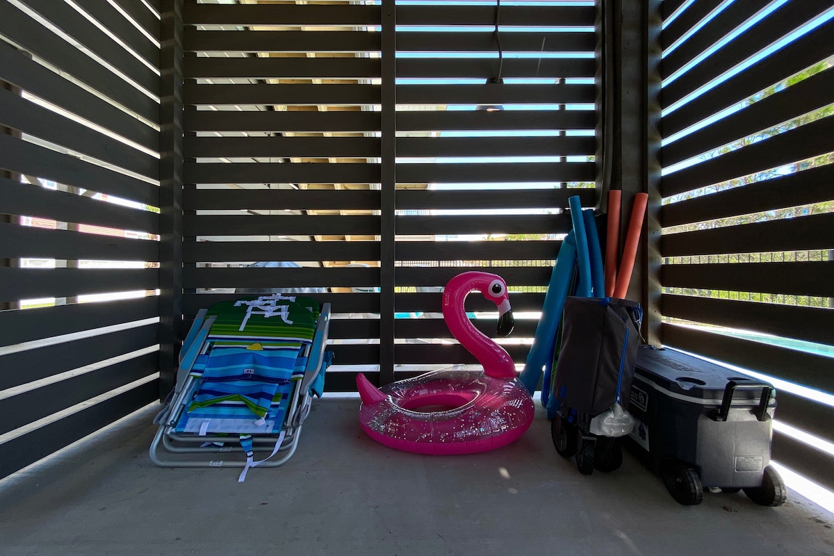 Ground-level provides ample parking spaces under the first-floor main level. It also has an outside storage unit that houses beach chairs, umbrellas, wagon, ice coolers, and pool toys so that you don't have to bring any bulk items to fully enjoy the beach experience.
