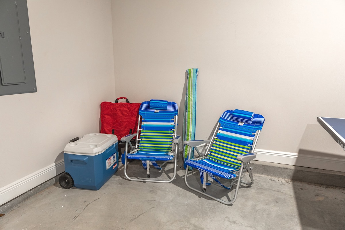 beach chairs, umbrellas, wagon, cooler, toys, outdoor BBQ grill etc