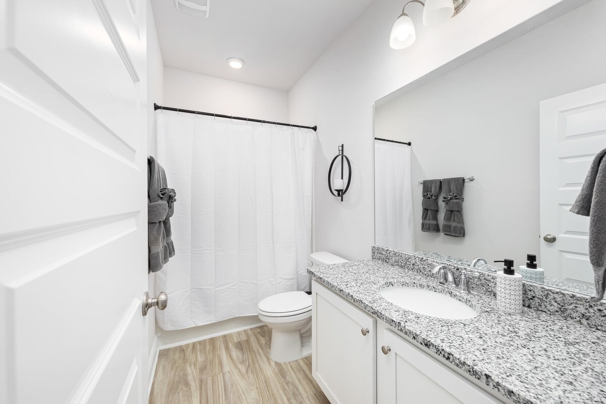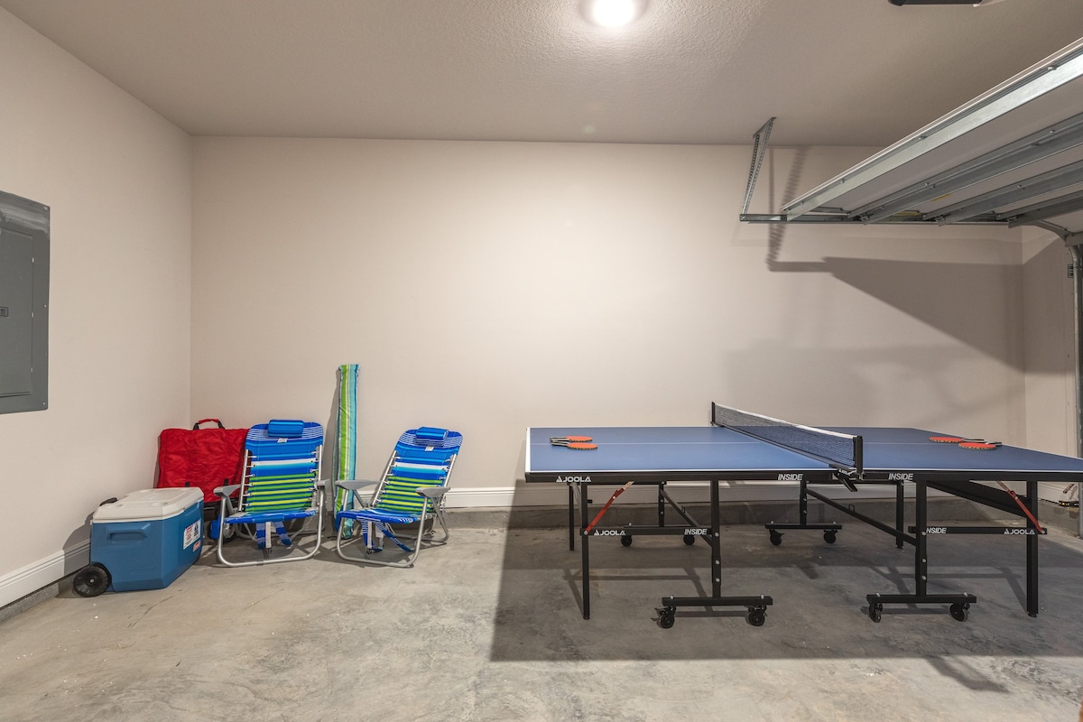 In the bath is a linen closet, dual vanity, separate shower and large tub. Down the hall are two more bedrooms separated by a second full bath. On the opposite side of the home are another two bedrooms separated by the third bathroom. Bunk bedroom has two Full/Full Bunkbeds that can sleep 8 children overall with NBA Jam arcade game. Garage also includes Ping pong table, foosball and Complimentary Beach gear such as wagon, cooler, umbrella, beach chairs etc.